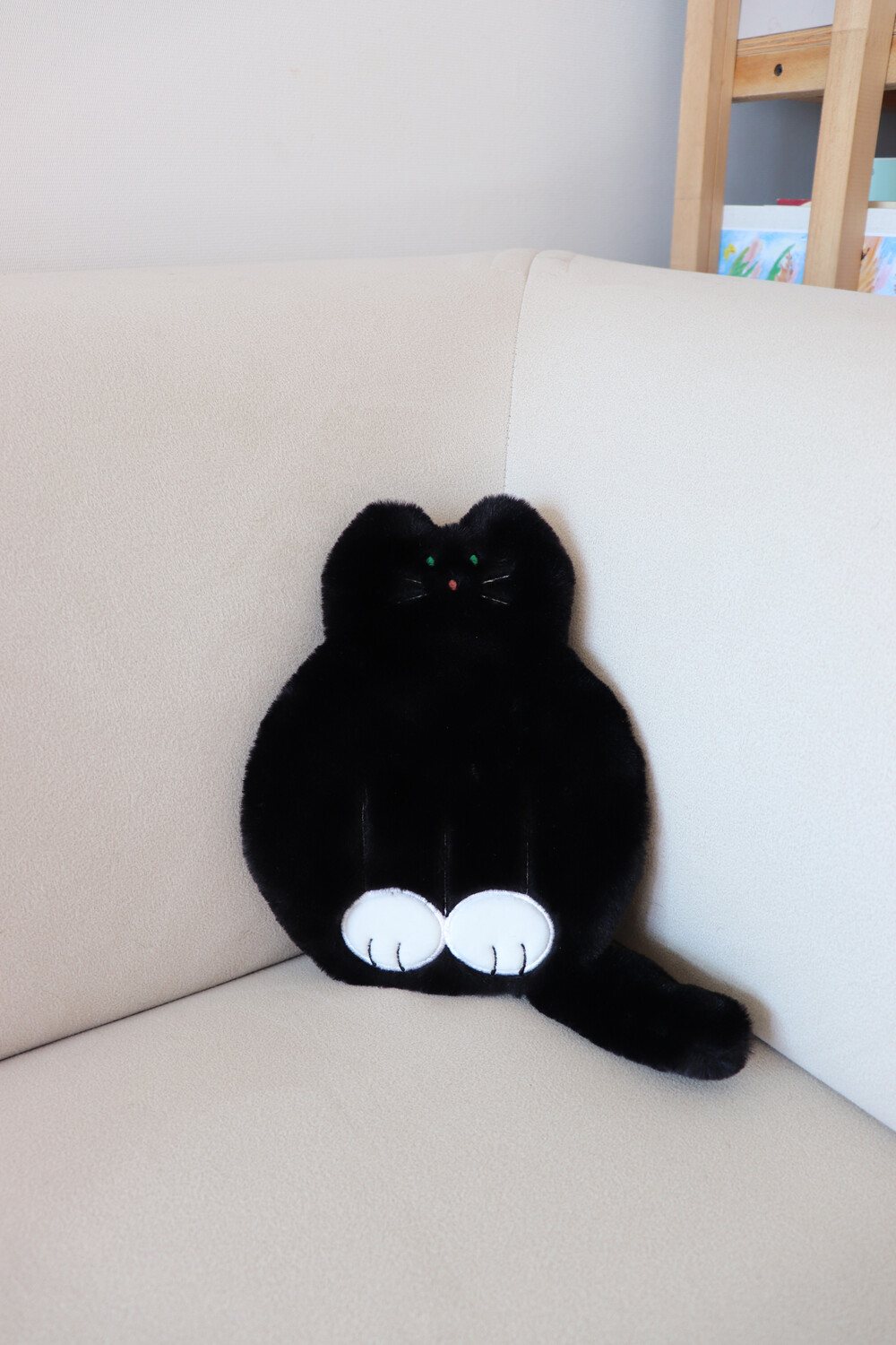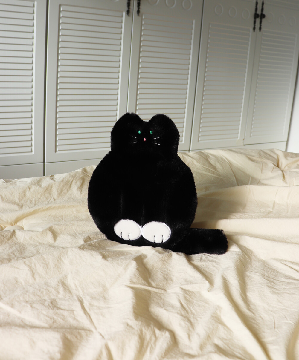 크고 둥근 몸에 쫑긋 솟은 귀가 귀여운 검은 고양이입니다.