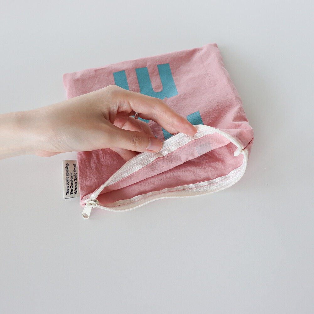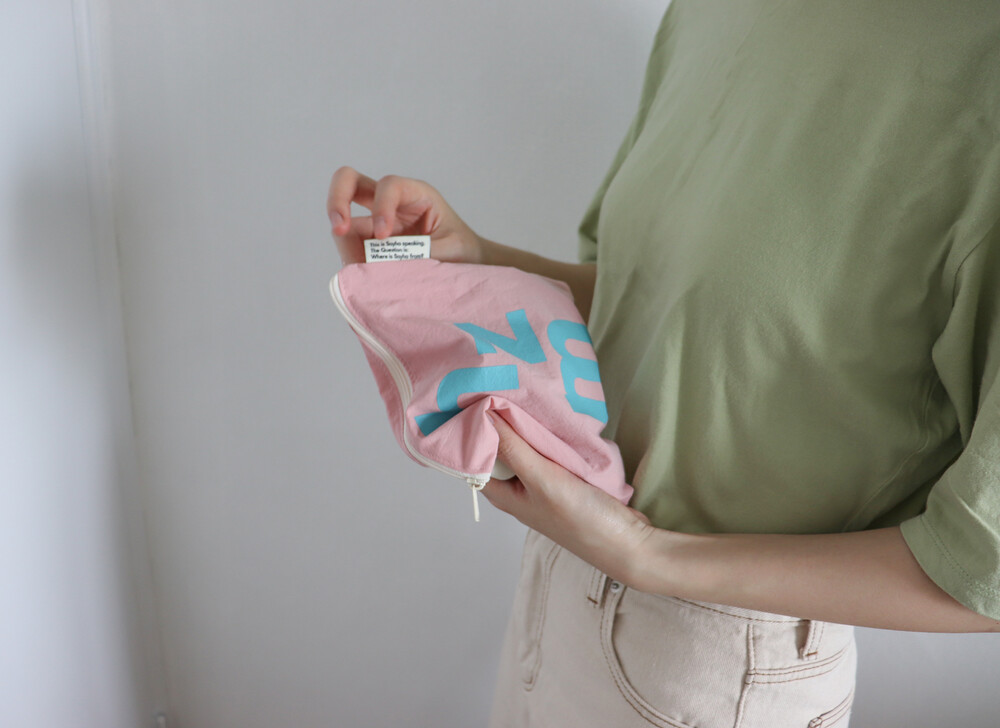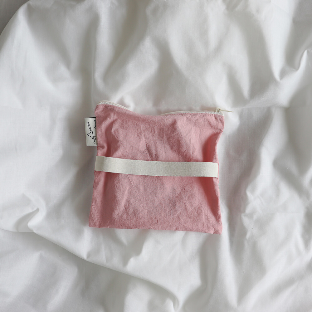 기존 파우치들과 다르게 뒷면에 밴딩을 부착하여 편리함과 실용성을 더했습니다. 밴딩 부분을 손목에 걸치거나 팔목에 끼워서 다양한 포지션으로 연출하며 자유롭게 사용할 수 있습니다.