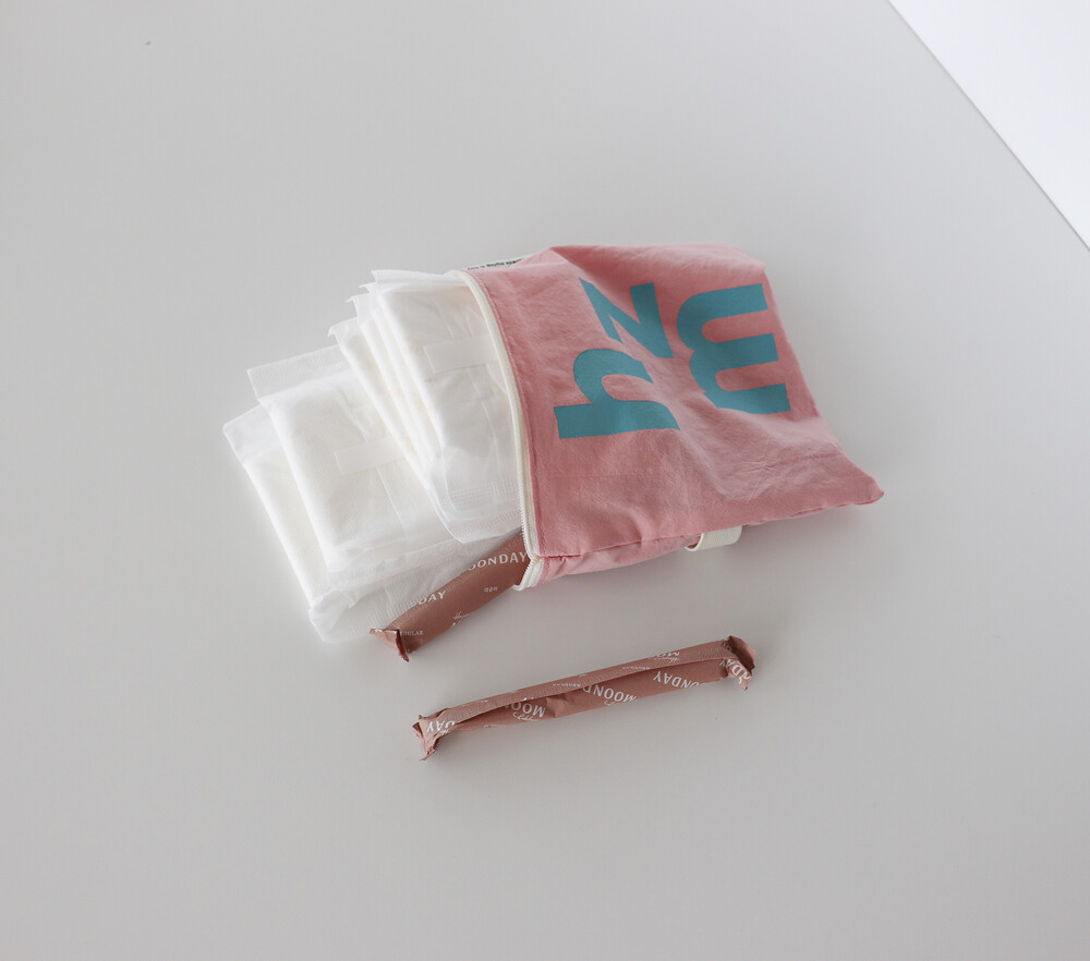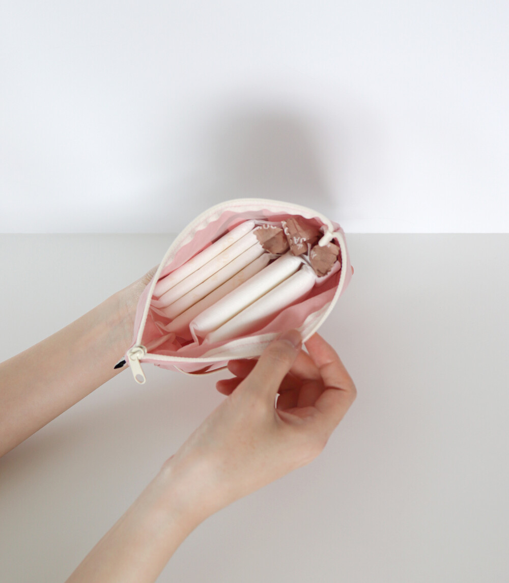 정사각형 모양의 넉넉한 사이즈로 화장품, 핸드크림, 여성용품, 전자기기 등 다양한 종류의 소지품을 수납하기에 편리합니다. 큰 사이즈의 생리대나 탐폰도 여유롭게 들어가는 사이즈입니다.