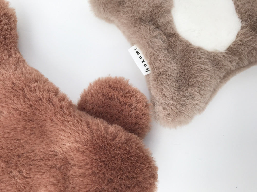 - 오염이 있을 경우, 미지근한 물에 중성세제를 풀어서 조물조물 문지르듯 약하게 손빨래를 해주세요. 털결을 계속 보송하게 유지하기 위해서 손세탁하시는 것을 권장드립니다. 세제를 푼 물에 오래 담가 놓지 마시고, 물기를 대충 짜낸 후 마른 수건으로 꾹꾹 눌러 세제와 습기를 제거해주세요. 물기를 탈탈 털어내고 바람이 잘 통하는 그늘에서 건조해주세요.