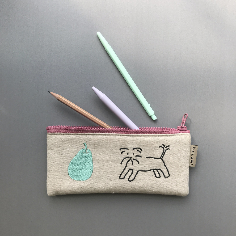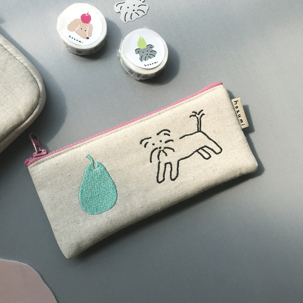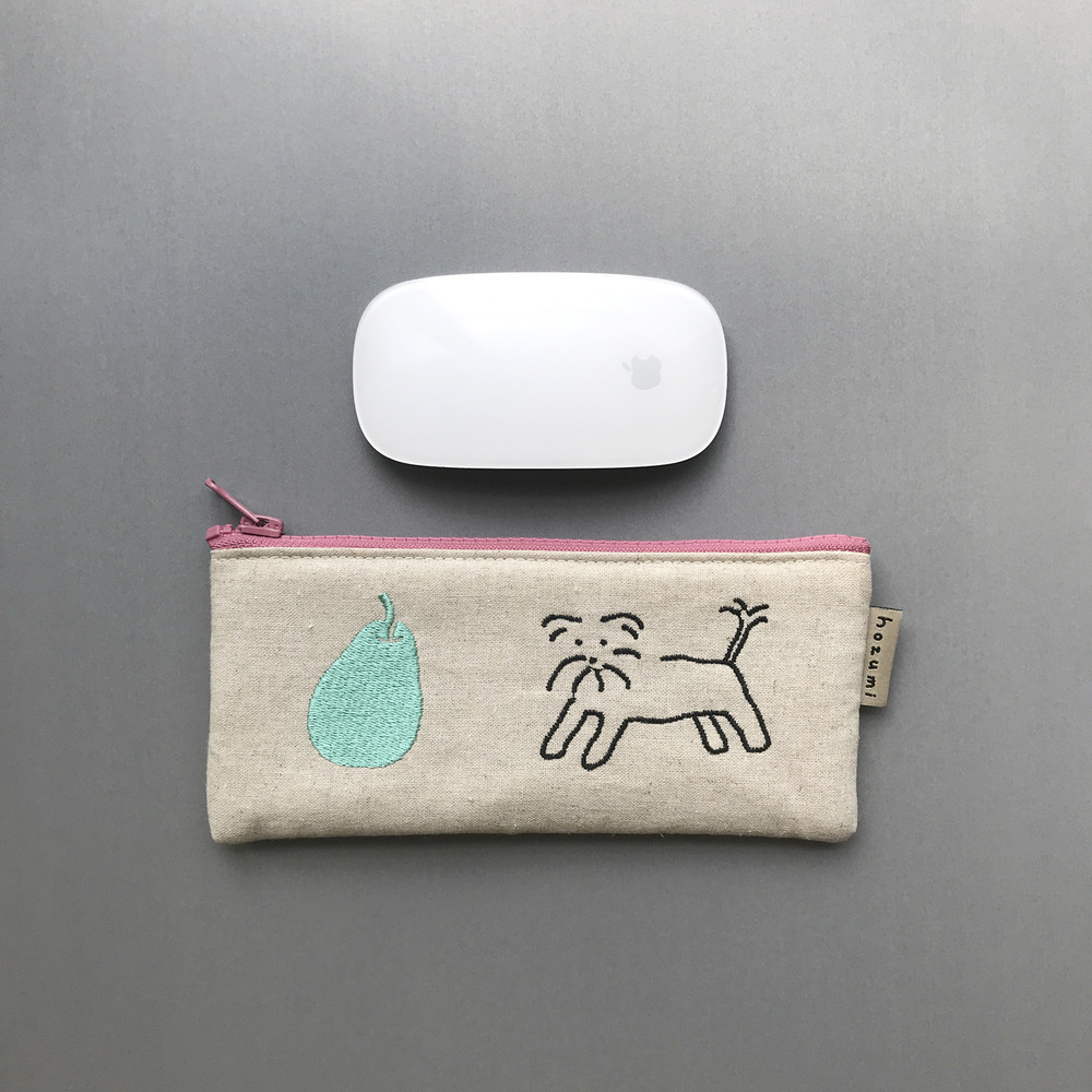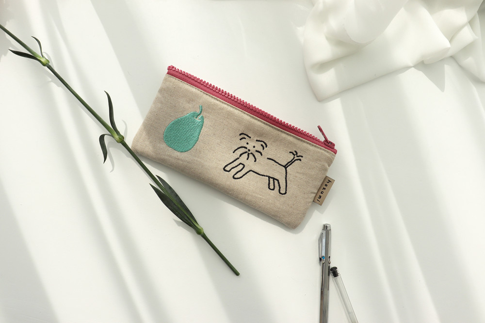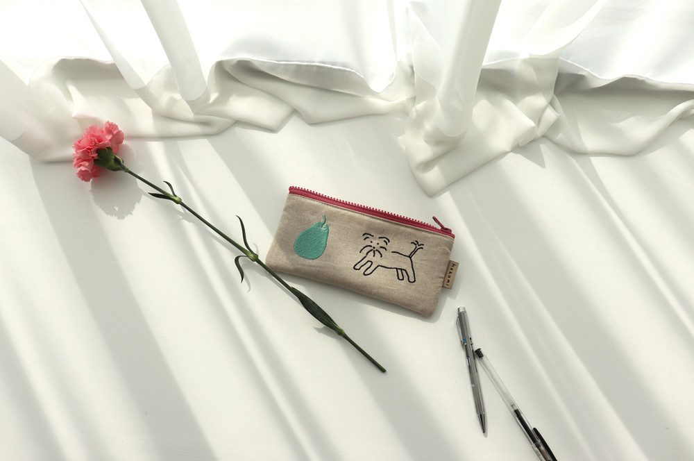 <개와 과일>의 회색개와 서양배 필통입니다.