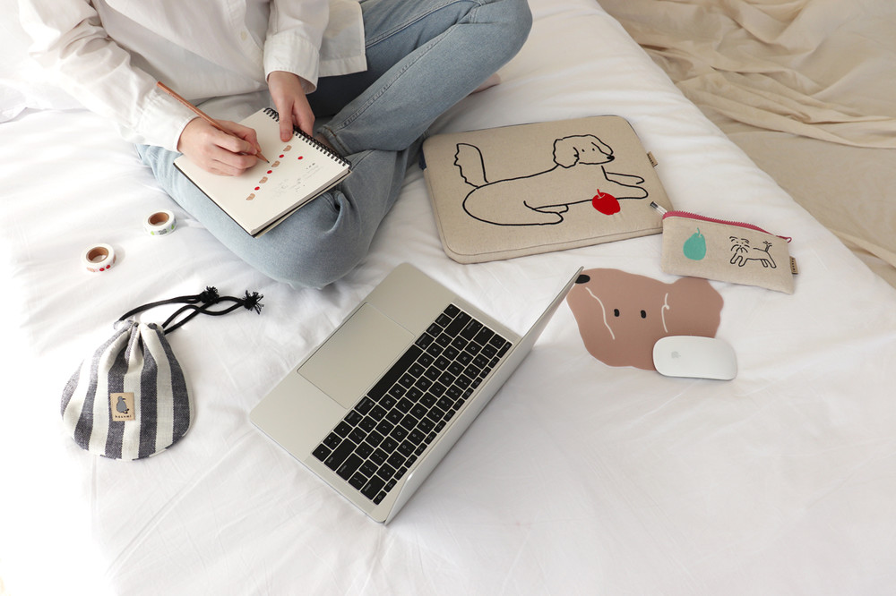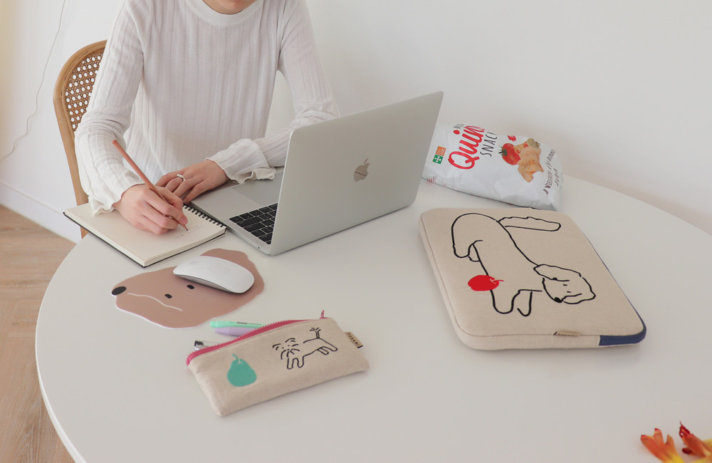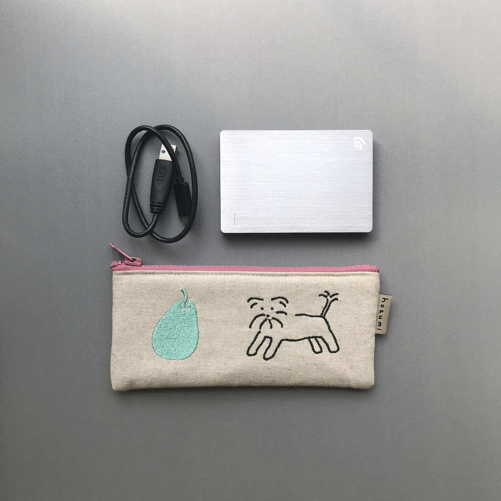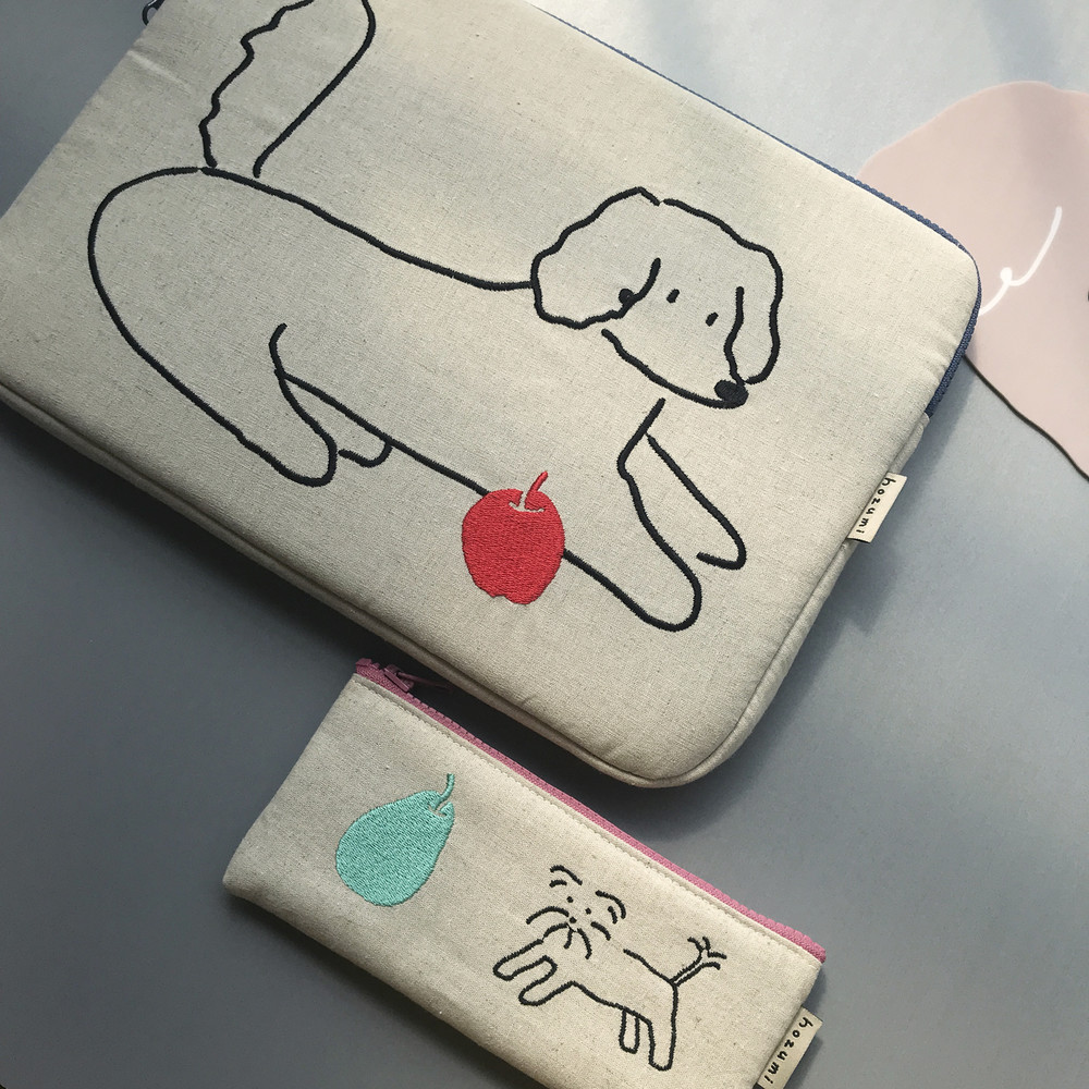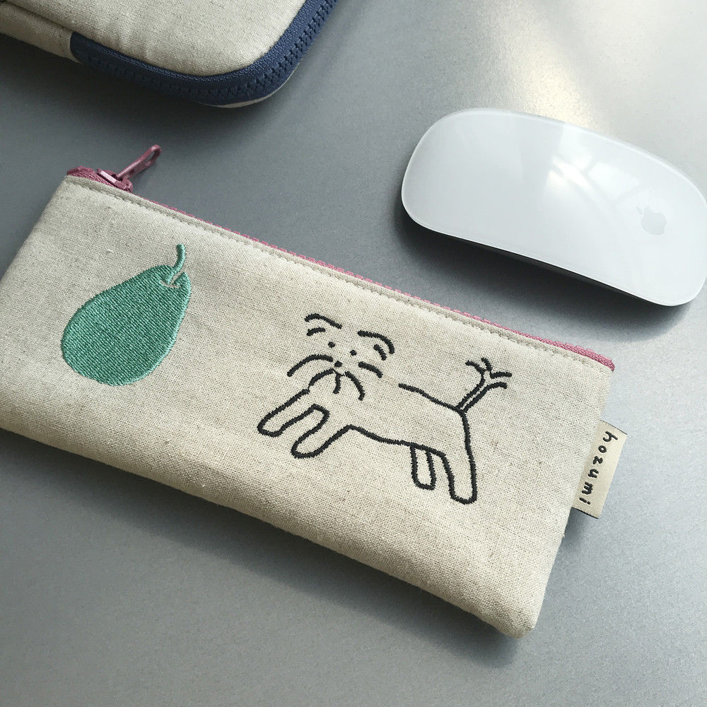 <개와 과일>의 회색개와 서양배 필통입니다.